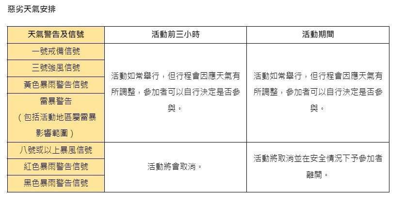 - 活動當天,如遇上惡劣天氣情況,請參閱以下惡劣天氣安排。